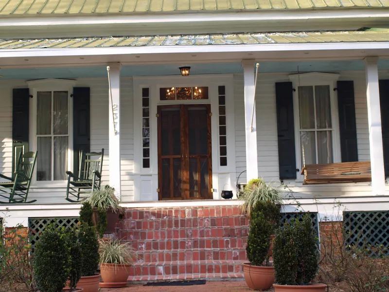 This 1840's plantation home has been tastefully restored with modern conveniencies while preserving its graceful past. There are beautiful interior finishes, a modern gormet kitchen with granite countertops, stylish baths, large cedar-lined closets, elegant chandeliers, ceiling fans, and a Jacuzzi tub on the landscaped rear terrace. These contempory improvements are at home with the 15 foot ceilings, heart pine floors, and the 7 foot tall windows in the vernacular style home which has elements of Georgian and Greek Revival architecture. A 58 foot long porch spans the front of the house.