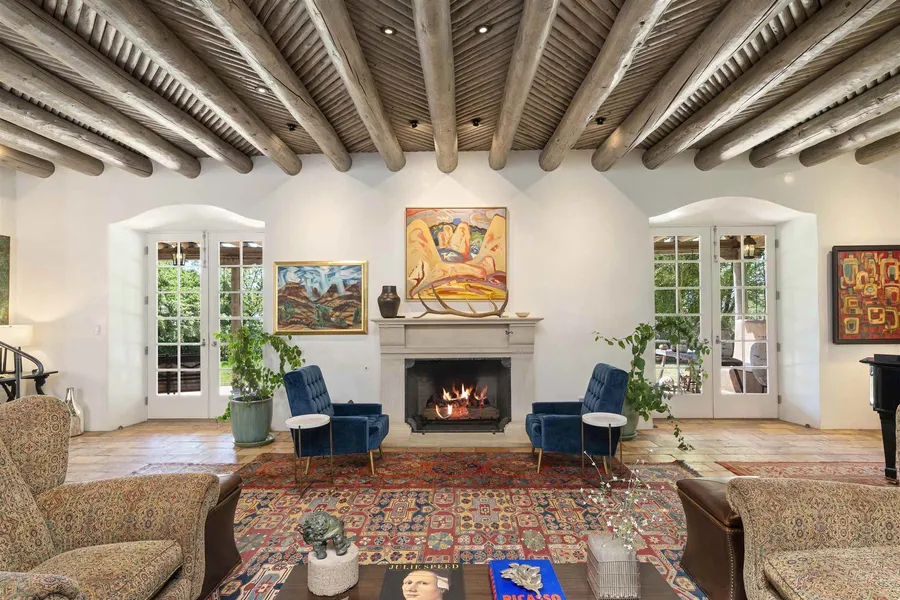 Seldom does a home of this magnitude come on the market in the entire Santa Fe area. Situated on the historic Old Santa Fe Trail, this sprawling Pueblo Revival estate is comprised of the main house, a detached guest house, swimming pool, caretakers quarters, and horse paddock area - all enclosed in a private, gated compound. Set next to Georgia OKeefes old estate, this prime in-town location is minutes to the Plaza, yet affords a level of privacy seldom seen in Santa Fe. The main house has been meticulously updated and maintained, and is in move in condition. The formal living room sets the tone for meeting guests, and features high ceilings, antique roof tile flooring, lots of windows, and has ample wall space for art. Similarly the formal dining room is ideal for day-to-day use and festive entertaining occasions. The kitchen is a centerpiece to the home, with many features seldom found...