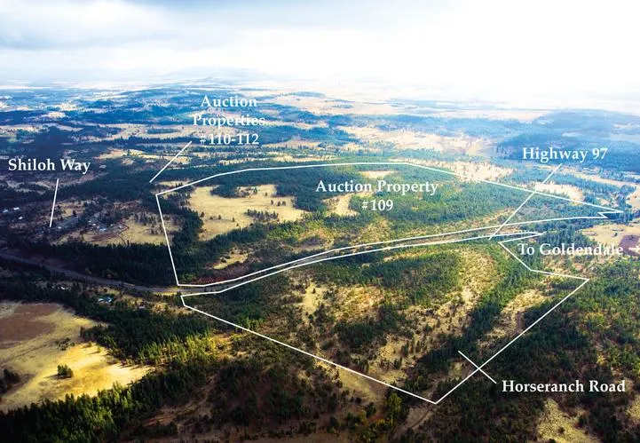 This 140 acre tract has 5 acre zoning with potential for development of 29 homesites and is located approximately five miles north of Goldendale. Auction Property #109 is located across US Highway 97 east of the property. The property has over onehalf mile of highway frontage on US 97 with Horseranch Road, a county road, running along the western boundary. There are a number of excellent building sites with views south to the Klickitat Valley. The majority of the property is fenced and is stocked with ponderosa pine, and could be retained as a ranch, or divided into three to five 20 to 30 acre ranchettes. There is power along Horseranch Road. Onsite septic and wells will be required.