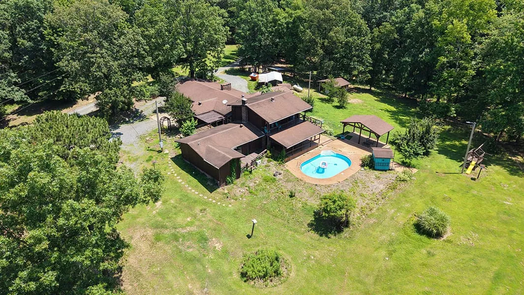 Wickes, Arkansas, located in southern Polk County, is where you'll find this custom-built split-level home with an in-ground swimming pool, outdoor pizza oven, and plenty of storage!. The property includes 8.97 acres with quick access to the town of Wickes, which provides all the necessities with a post office, coffee shop, restaurants, fuel, car wash, school, churches, hardware store, and a Dollar General. This property is ideal for the person who enjoys spacious living with designated entertaining areas all surrounded by nature. The 2,619 square foot home is a combination of rustic aesthetic with pops of glam and features three bedrooms, three bathrooms, ample storage space, a home theater, an outdoor covered pizza oven, and a swimming pool. The entrance and main level are well laid out with a spacious kitchen, dining room, and living room that have open sight lines and provide the flow of an open space, but well-defined areas ensure adequate room for daily living or entertaining. The high-end, custom-look kitchen is complete with modern appliances, Corian countertops, glass-front display cabinets, and a bay window looking to the front of the home. A focal point of the main living area is the built-in wood fireplace, surrounded by brick stonework and vaulted ceilings with rustic wooden beams. Neutral wood-look vinyl flooring, a built-in display case/bookshelf, and a glass bay window that goes all the way to the floor are bonus features of the design. Just off the dining room is a sunporch with sliding glass doors providing access to the outside patio and covered cook shack housing an outdoor pizza oven. On the upper level of the home, there are two bedrooms, both with large closets and access to the upper deck, which overlooks the swimming pool. Sliding doors allow for natural light and provide a framed view of the pool area and the beauty of nature. A three-piece bathroom serves the upper floor with a shower/tub combo and custom vessel sinks. The lower level of the home is just a few steps down from the main living area. Enter into the theater room, where you will find dark shiplap walls and a wall-sized screen, the perfect setting for movie night. Also on this level of the home is a primary suite with two extra spacious walk-in closets and an attached bathroom with separate vanities, a toilet room, and a tile walk-in shower. Just off the primary bathroom is an additional room with a jetted tub (in the installation phase) and linen storage. The primary suite is flanked with floor-to-ceiling mirrors and space to set up a small sitting or dressing area. The laundry room, a third full bathroom, and an additional bonus room opening to the pool patio are all on the lower level. Each room enjoys sliding glass doors that open to the covered patio by the pool. Each floor of the home has large storage closets, in addition to the bedroom closets, giving space to comfortably store additional linens, home decor, dishes, and personal belongings. In addition to central air, there are zoned units to provide extra cooling. The primary suite has a dedicated electric hot water heater to ensure a steady supply of hot water to the shower and future jetted tub, while the rest of the house is served by a larger gas water heater. The in-ground swimming pool has its own covered entertaining area and an additional covered patio nearby with direct access to the home and a full-sized bathroom downstairs. Easily access the upper floor of the home by way of stairs connecting both decks. This property has so many special touches! Chandeliers adorn many of the rooms, offering a rustic glam aesthetic. Numerous options for both can be found both inside and outside of the home. In addition to multiple outbuildings, more storage is available just off the open portico/carport area attached to the home. Wired with electricity and double doors, it makes it easy to park a golf cart, mower, or house spare furniture. The acreage consists of a healthy stand of hardwood trees and is fenced and cross-fenced, providing an option for a horse or a few other animals. A pond offers a water source for livestock and local wildlife, in addition to a spot to cast your line. The property is in a beautiful country setting, just a minute from the main highway. With a swimming pool, a home theater, and a pizza oven, you are all set for big family living and entertaining! To make this spectacular place yours, call Deedee or Luke Alston today to schedule a personal tour.