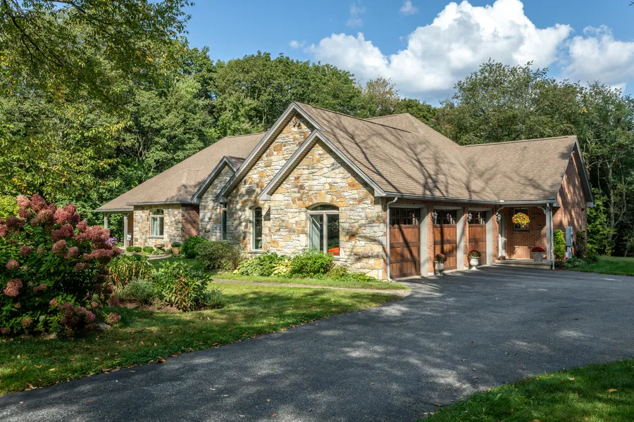 Gorgeous Stone & Brick 3,059sf Custom Ranch Style Home picturesquely set on over 22 acres in the Litchfield Hills for the 1st time on the market with a barn & shed. This well built 3BR & 2 1/2B home was constructed by an established high end builder of 40+years for his own family in 2002. Upon entering the foyer on a chilly day, you'll notice warm radiant heated floors, while the rest of the home has radiators-with central AC for summer. An office or potential 4th bedroom is on the left, and the dining room with raised paneling and crown molding is on the right. Straight ahead, the spacious living room with vaulted ceiling and wood burning fireplace is open to the impressively renovated kitchen. This chef's delight, features SS appliances, an island with seating for 4, and loads of cabinetry space. The primary bedroom with wide board white oak floors and a walk-in closet are on one side of this home, and the 2 guest bedrooms are on the other, sharing a Jack & Jill bathroom. The primary bathroom features a jet tub and separate shower. A generous sized laundry room is close to the primary and there's a powder room as well. Included, is a Kohler whole house generator-just in case. From Spring to Fall, enjoy the vast variety of perennials that grow & bloom throughout the season. For gardening, enjoy several raised beds for plantings. Goshen is home of Tyler Lake-a couple minutes away, Mohawk Mountain Ski is just 10 minutes, and The Litchfield Green is 10 minutes away.