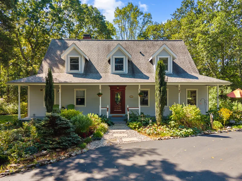 Beautifully updated Cape Cod with a dreamy wraparound covered porch offering 3/4 bedrooms, including a highly desirable first-floor primary suite. Every detail has been thoughtfully designed to blend comfort, functionality, and style. At the heart of the home is a chef's kitchen featuring custom cherry cabinetry, brass hardware, high-end appliances, a pantry, and endless storage. From the kitchen, step into the mudroom for everyday convenience, or head outside to the paver patio, perfect for outdoor dining and entertaining. The spacious living room is filled with natural light from dramatic two-story windows and anchored by a wood-burning fireplace capable of heating the entire home. Anderson French doors open to a new private deck overlooking beautiful gardens, creating a peaceful retreat. The flexible layout offers plenty of room for everyone-whether you need a fourth bedroom, home office, or guest space. The main level also includes a full bath and a convenient laundry room. Upstairs, you'll find two additional bedrooms and a remodeled full bath. The basement features a workshop, a versatile office/yoga studio, along with unfinished space you can tailor into the ultimate family room. Set south of Route 1 in the desirable A. W. Cox School District, this home is close to Guilford's historic town center, Chaffinch Island Park, and scenic hiking trails. With so many thoughtful updates inside and out, this Cape Cod is truly move-in ready.