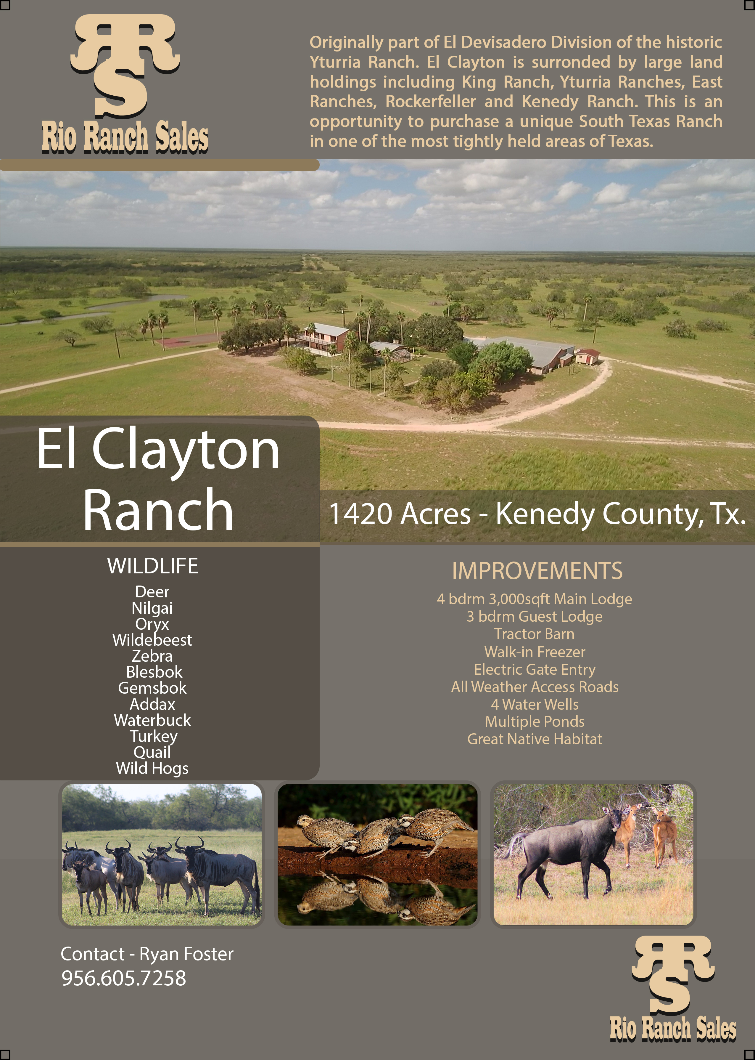 General: Originally part of the El Devisadero Division of the Historic Yturria Ranch. El Clayton is surrounded by large land holdings including King Ranch, Yturria Ranches, East Ranches, Rockefeller and Kenedy Ranch. This is an incredible opportunity to purchase a unique South Texas Ranch in one of the most tightly held areas of Texas. This 1420 acres high-fenced ranch is located just north of Raymondville, Texas off HWY 77 in Deep South Texas. This ranch consisits of incredible native habitat and offers some of the best hunting and grazing opportunities in Texas. It is also just a short drive to Port Mansfield home of some of the best Saltwater fishing in Texas!