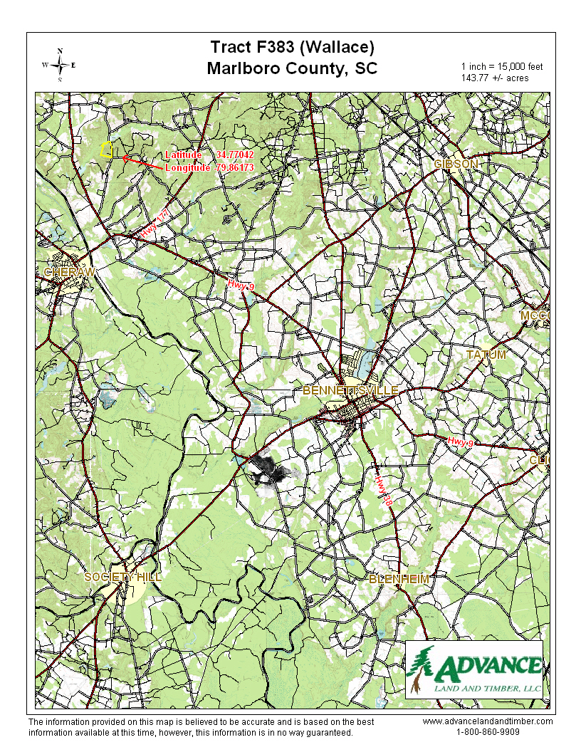 Research Parcel InformationFrom Bennettsville, take Hwy 9 north approximately 12 miles towards Cheraw. Take a right on Hwy 1 and travel about 1 mile. Take a right onto SSR97 / Billy Wallace Road and travel about 2 miles. Tract will be on your left beginning at Hatcher Hill Road.