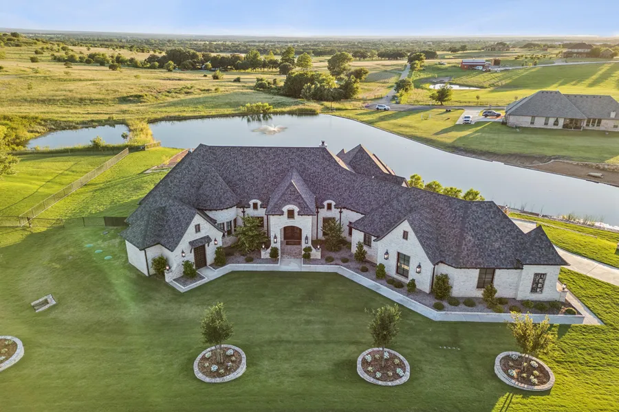 Experience refined living in this breathtaking custom estate set on 2.35 acres within the gated, golf-course community of Canyon Westlocated in the top-rated Brock ISD. Designed to impress & built with precision, this sprawling single-story home offers an amazing retreat. From the moment you arrive, the elevated faade with extensive stonework, manicured grounds, and lush landscaped front yard creates a commanding presence. Inside, the home showcases exceptional craftsmanship with rich hardwood flooring, stone-accented feature walls & soaring vaulted ceilings with exposed beams. Every detail has been carefully curated. The chefs kitchen is a culinary masterpiece, equipped with top-tier appliances, an imported Italian range, and an integrated sound system that carries throughout the interior & exterior. The heart of the home is the spacious living area, anchored by a dramatic floor-to-ceiling stone fireplace and framed by panoramic windows that flood the space with natural light. A well-appointed wet bar connects the living, dining & kitchen areasperfect for entertaining. Retreat to the luxurious primary suite featuring beamed ceilings, a stunning brick accent wall, and a spa-inspired bath complete with dual vanities, a soaking tub, walk-in shower, and custom-designed closet. Additional spaces include a media room, a fitness room, a home office with built-ins, a large mudroom, and a fully equipped utility room with space for an extra refrigerator, sink + storage. Step outside to a private resort-style oasis. A custom-designed pool and spa with a cascading waterfall take center stage, surrounded by desert-style landscaping and oversized seating areas perfect for fireside evenings. An outdoor shower adds convenience and enhances the true resort feel. The over 1-acre pondwith stone walls, ambient lighting, fountain, and fish-ready accessadds a tranquil focal point and enhances the propertys outdoor allure. This one-of-a-kind residence is move in ready!
