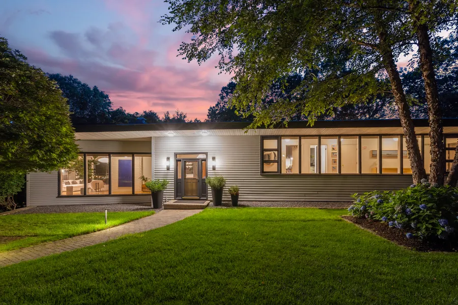 Live in perfect communion with New England’s four distinct seasons in this exceptional mid-century masterpiece where the beauty of nature is the focus of each space, and every room elicits an involuntary exhale. A horseshoe driveway and mature landscaping provide privacy for this indoor-outdoor California contemporary retreat. All three levels are accessible via the open foyer with inviting see-through views to the back yard. A seamless white quartz countertop/backsplash and custom Farrow & Ball painted cabinetry with Jens Risom pulls anchors the u-shaped kitchen. Black matte Brizo faucet/hardware services the oversized stainless steel sink. Wolf wall oven and microwave, Subzero refrigerator, Miele cooktop and Bosche dishwasher are the high-end machines that make this hardworking kitchen hum. Jonathan Adler and Design Within Reach lighting illuminates the oversized dining area and glorio...