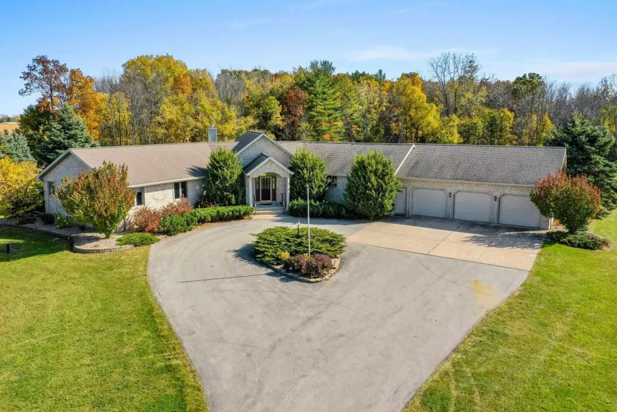 Fabulous 1 story walk out located on approx. 15 acres! Approx 39x29 outbuilding w/ concrete floor & 3 overhead doors, garden plot, garage shed & fruit trees! This home offers large living rm w/ wall of windows overlooking your beautiful wooded & private backyard. Large primary bedroom w/ full bathroom & walk in closet. 2 other generous size bedrooms on the main level along w/ 1st floor office. Spacious light & bright kitchen w/ plenty of room for large table & overlooks beautiful backyard. Walk in pantry, 1st floor laundry room w/sink. Large mudroom off of the 3.5 stall garage w/access to the basement. Lower level walk out & partially finished family rm w/wood FP, stubbed for bathroom, & daylight windows for possibly adding a 4th bedroom, TONS of storage. Country with convenience!