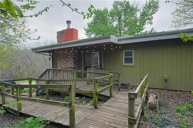 Unique home w/covered trex deck on beautifully wooded acreage. 15 acres includes streamway, well & cistern, fencing & pole barn for livestock, mowed paths w/turn arounds avail for vehicles, firepit, garden area, and treehouse. rural water, Geothermal heat, two water heaters, water softener, cedar dry sauna. Two cell phone signal boosters staying with home. There is a window in lower level living area that was covered by previous owner. Could be revealed to add light and eggress to that room.