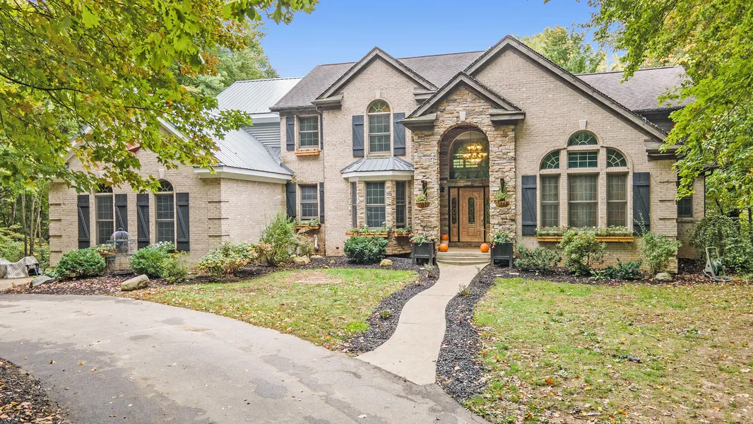 Show Stopper! Dream home on 15.5 acres w/ all the details you're going to love. Grand enterance, winding driveway to a wooded story book setting. Full brick home w/ gourmet kitchen & granite counters. Double sided fireplace. Large living room w/ warm natural light & dramatic cathedral ceilings. Main floor master suite w/ 2very large walk-in closets. 2nd master suite on 2nd flr. 3 more very large bedrooms plus a jack-jill fullbath. The floors on each lvl are concrete w/ in floor heating. Walk-out Lower lvl has 12'ceilings daylight windows & has studs in place, plumbed for kitchenette, craft area with sink, 2bathrms & a kitchen. Extra garage 48x32 w/ a heated full finished bath.11'ceilings,6''concrete flrs & 10'overhead door. Dual septic system. Geothermal heat & cooling!