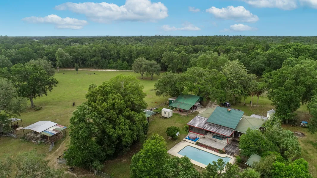 BEAUTIFUL COUNTRY HOME IN NEWBERRY FLORIDA! 3/2 farmhouse on 15.69 acres with an inground pool! Inside, the large Livingroom offers a Douglas Fir beamed ceiling, perky cedar lined walls and a wood burning fireplace. The kitchen is spacious in size, with an electric cooktop on the center island and a walk-in pantry. 3 large bedrooms offering plenty of space with the second bedroom being all redwood walls. Outside there's a covered porch overlooking the pool and plenty of patio space. There's also and apartment on the property for your guests or rent is as an Airbnb. A pole barn for storing your tractor and the property is fenced so there's plenty of room for your cows and horses to roam. Come live the country lifestyle in Gilchrist County and make this property your family homestead! Fun fact, the outside of the home is all Redwood lumber shipped by railroad from California to Gainesville...