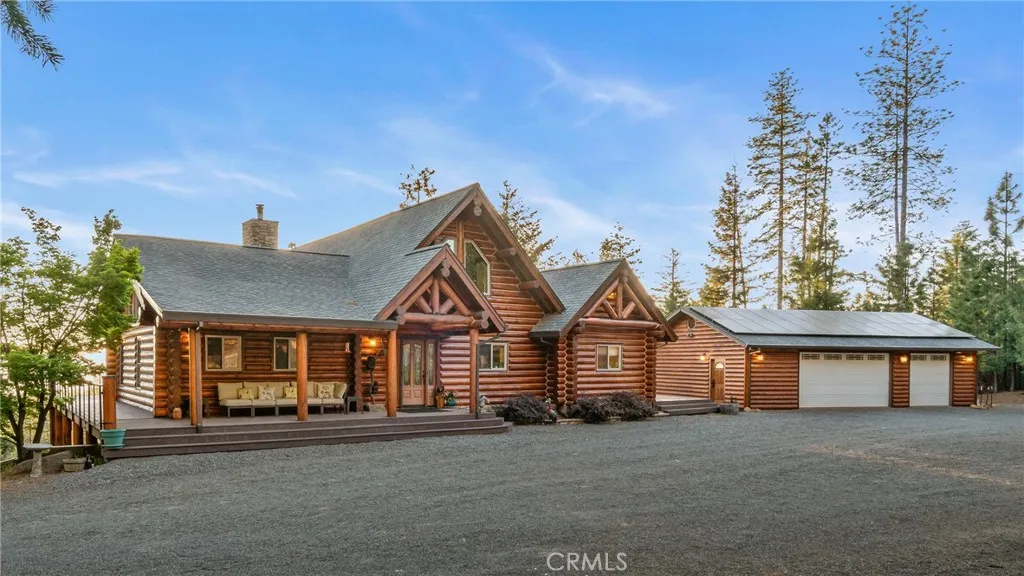 Stunning log home in the Chico foothills with expansive views of the valley and the coast range. The 4 bedroom 3888 sq. ft. custom home is nested in the quiet of manicured pine, oak and fir trees. Upon entering through the oversized front door, you walk into the great room with its towering 20' foot ceiling. To your right is the huge kitchen any chef's dream with its extra-large island, 5 burner stove with double oven, too many cupboards to count and second prep sink. Above the kitchen is a loft accessed by a charming spiral staircase. Beyond the kitchen is a beautifully appointed half-bath, a large pantry and a convenient mudroom/laundry room. To your left is the striking custom wrought iron railing surrounding the stairwell and beyond it is the large master bedroom and bathroom with dual sinks and open, walk-in shower with dual shower heads. In front of you is the open living room and the prow of the house with its wall of windows and sliding glass doors that open onto the 1500 sq. ft. composite Trex-type deck, wrapping around 3 1/2 sides of the house surrounded by horizontal stainless steel custom railing. From this deck you can enjoy the view and the beautiful sunsets or the stars as you look over your 15-plus acres of forest that has been meticulously maintained and recently masticated. This is the main floor of the house while the downstairs boasts another living room, a full bath and 3 bedrooms. There is also a mechanical room downstairs that doubles as a storage area. The 10' high ceiling here make the space seem expansive and the 8' tall sliding glass doors lead out onto a patio area that has a hot tub and is fully fenced with the same railing as the deck. The entire house is heated with efficient and quiet radiant floors, plus there is a wood burning stove upstairs to further warm the living space. Outside, you will find a detached, over-sized 3 car garage with built in cabinets and attic-space storage. Let's not forget the 1,944 sq. ft. shop with room for 6 more cars or toys, with an extra tall door that will fit your RV or trailer. In addition, there is a huge 55' by 30' fenced garden area, a Generac auto-start propane generator, a buried 500 gallon, owned propane tank, a paved 1000+ foot driveway, a building housing 1,500 gallon and 2,500 gallon water tanks with even more storage, multiple 2 1/2 inch stand pipe fire hydrants located around the property. All this situated on three contiguous parcels of 6+, 6+ and 3+ acres. OWNED SOLAR