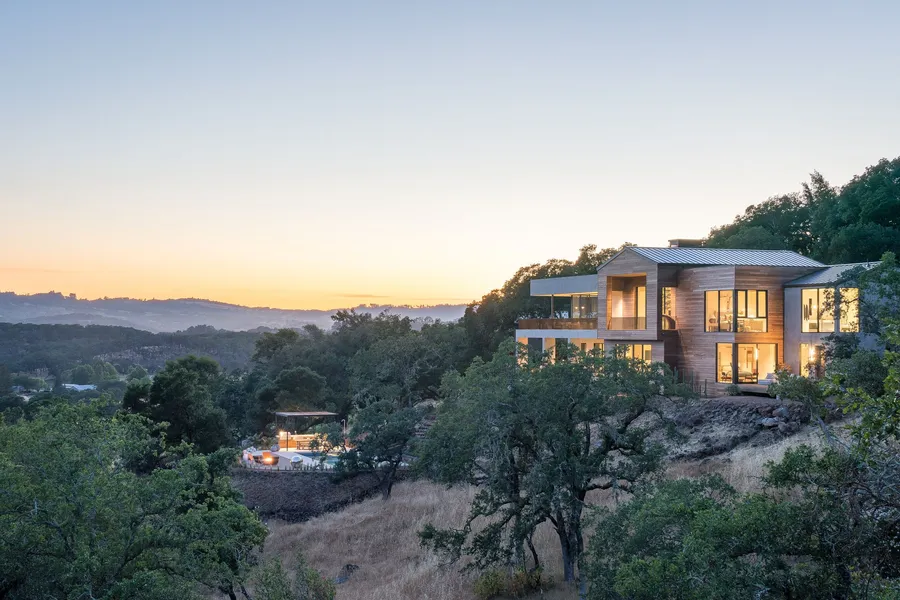 Experience sophisticated living in a classic California setting. Dramatic views encircle this over 15-acre hillside Sonoma Valley property situated up a gated, private road with an additional gate at the entry. The modern design with light, airy interiors seamlessly transitions to a lightly colored, Santa Barbara smooth marble mission finish stucco exterior blended with warm, natural wood tones. Pitched metal roofing brings a traditional undertone softening the contemporary architecture.