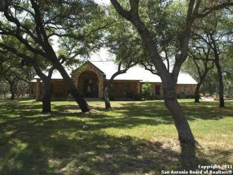 What a find! Stately ranch-style rock home on 15 oak studded acres. Open living area w/lg. rock fireplace. Huge island kitchen & dining areaw/lots of windows. Lg. master ste. w/sitting room. Cedar Closet. Gameroom. Beautiful hard wood flrs. Huge utility rm. 45X40 custom, insulated bldg. in back (very nice). RV parking w/septic for RV. Great horse property. Level & completely fenced. With new 281 superstreet quick trip in and out of San Antonio. Private river park on the Guadalupe River!