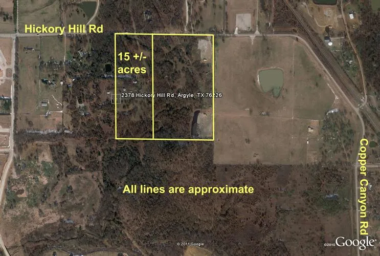 15 acres of an approximately 39 acre lot. Great building site on Hickory Hill Road in Argyle, close to Copper Canyon Road featuring many trees, a creek and no city taxes. Some floodplain, conveniently located with easy access to the DFW metroplex. Buyer to verify all information.