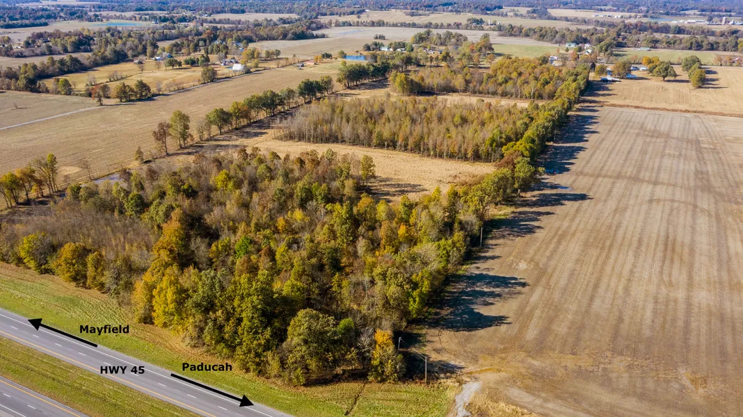 Great investment opportunity with endless possibilities! 15 unrestricted acres with approx. 415 feet of frontage on Hwy 45 between Paducah and Mayfield. Great farming, hunting, or development potential!