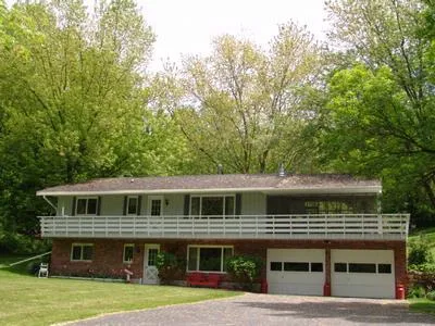 3 bedroom, 2 bath brick raised ranch home featuring newer furnace and central air, solid surface countertops, large deck & screened in porch, main level family room with free standing wood fireplace, large living room with gas fireplace, lower level family room/spa room, attached 2 car garage and detached 2 car garage located on 15 wooded acres with 2 springs, spring fed pond and rock outcroppings, nice blacktop driveway.