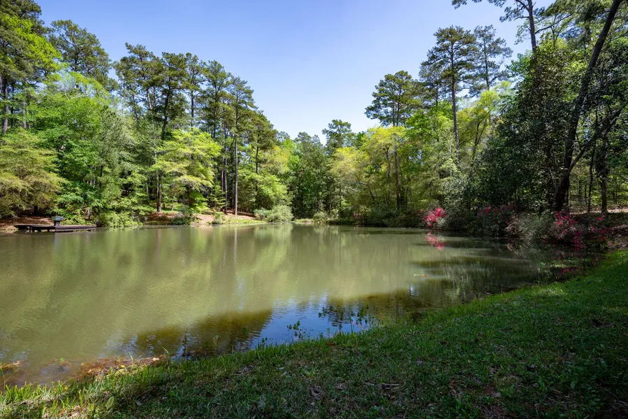 The property is entirely fenced and features hilly terrain, well-drained sandy soils, and a large open grassy meadow but is mainly wooded in large specimen trees including mulberry, cedar, southern magnolia, beech, hickory, pecan, saucer magnolia, redbud, dogwood and numerous spring-time flowering plantings such as bridal wreath and azaleas. The approximate one-acre spring-fed lake with pier has bream and bass and is surrounded by sprawling formosa azaleas creating a beautiful park-like setting.