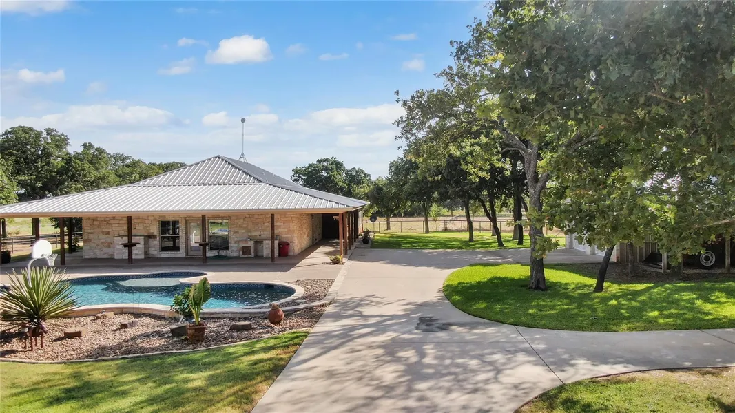 Beautiful home on 30 acres only 8 miles from Stephenville! Property that offers a unique blend of country living under big shade trees, quiet seclusion and modern comforts. Entering the property, you'll be captivated by every inch of its serene surroundings. Step inside the home and you'll be greeted by an open and airy floor plan custom shudders and cabinets that seamlessly combines functionality and style. The spacious living area with beautifully, wood beam ceiling and offers a stunning cozy fireplace. 3 BR with walk in closets 3.5 baths and plenty of space for a growing family. The kitchen is a chef's dream, featuring modern appliances, abundant custom cabinetry, and a convenient center island, making meal preparation a breeze. Take in the views from the wrap around porch or entertain from the cantina with TV, perfectly located beside the pool. Manicured yard fenced off with cattle g...