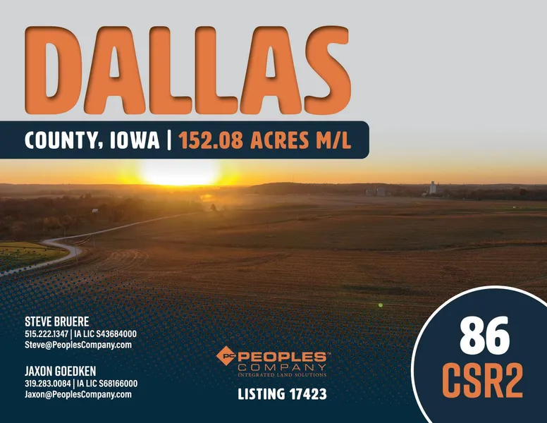Peoples Company is pleased to present a unique opportunity to acquire a high-quality tillable farm near Redfield in Dallas County, Iowa. The farm is located in Section 3 of Union Township in a strong farming area. The farm is located east of Redfield, Iowa on paved Old Highway 6 and gravel 310th Trail and consists of 152.08 m/l acres subject to survey, with approximately 139.98 m/l tillable acres carrying an excellent CSR2 of 86. Primary soil types on the tillable acres include high-producing Clarion loam and Webster clay loam.