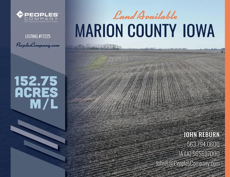 Offering 152.75 acres m/l of highly tillable Marion County farmland. The farm consists of 145.16 FSA Cropland acres carrying a CSR2 of 65.4. Of the 145.16 FSA Cropland acres, 140.38 acres m/l are being planted in a corn-soybean rotation with the balance being grassed waterways. The farm has excellent drainage with extensive tile and terraces (see attached Tile Maps). The tillable acres consist of highly productive Sharpsburg silty clay loam and Macksburg silty clay loam. The farm is open for the 2024 cropping season. The property is located 5 miles southwest of Pleasantville, IA on the Marion, Warren County line in Section 7 of Franklin Township.