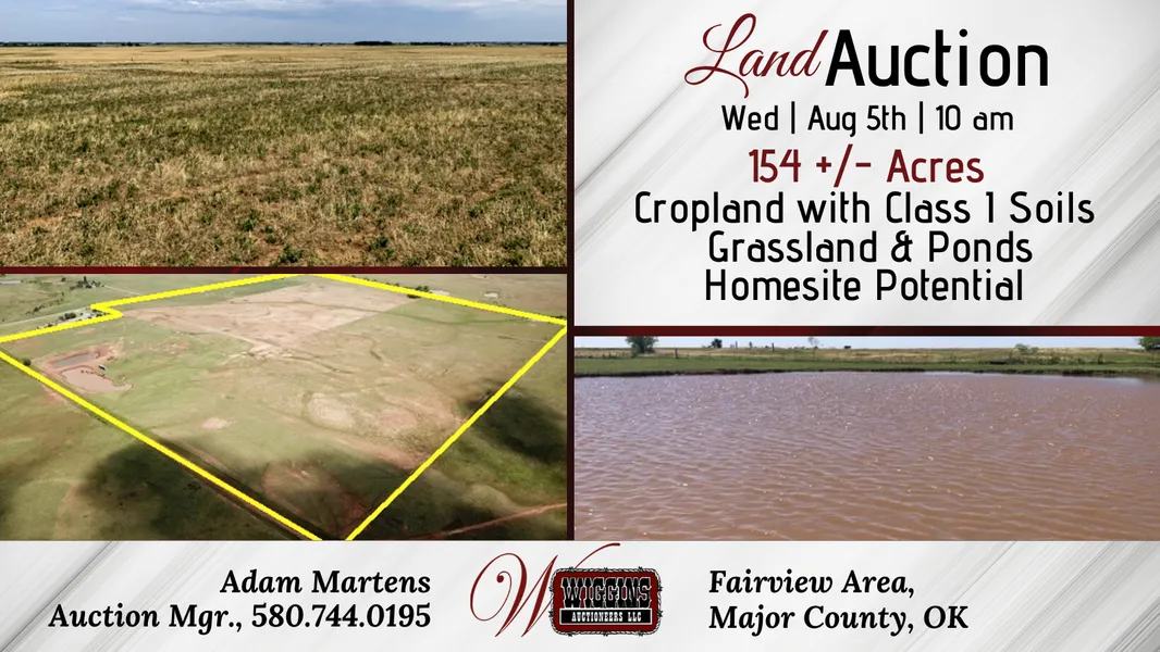 Legal Description: NE/4 of 31-21-11 Major Co., OK, less & except 6 +/- acre tract in the NE/c Crop: Does not sell. Minerals: Do not sell. 19 Taxes: were approx. $384.53. The 2020 taxes will be prorated to the day of closing. Possession: at closing. Registration: All bidders are required to register with valid form of ID and acknowledge and agree to auction terms & conditions. Absentee bidders who wish to authorize another person to bid/purchase on their behalf, please provide a letter of authorization. Contact the Auction Company for details. Terms: 10% of the purchase price is to be placed in escrow day of auction with the balance being due upon delivery of merchantable title. All information is taken from sources believed to be reliable; however, no guarantee is made by the auction company or its employer. Buyers should satisfy themselves as to acreage, crop base, condition, etc. prior to auction day. Announcements made day of auction take precedence.