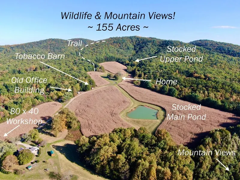 155 Acres of Country Living at it's BEST! Multiple building sites with mountain views, 35+/- acres of open cropland with (2) stocked ponds, 120+/- acres in mixed woods full of wildlife: deer, turkey, bear, etc., 80 x 40 work shop with wood stove heat and a 40 x 15 lien two, tobacco barn, old office bldg, farm house surrounded by huge shade trees, living room w/gas logs fireplace & flu for a wood stove, large master suite, sun room, office, on-demand hot water & small attached lawn shed/work shop. The various seasonal views of the Blue Ridge Mountains are priceless. Call today!