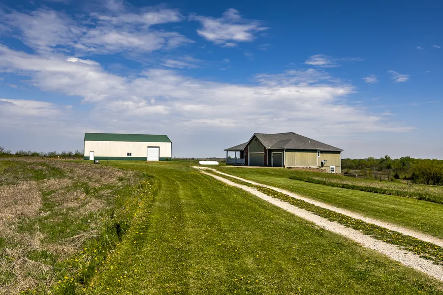 Welcome home to this beautiful 157 acre country home 25 min south of Topeka with easy access for commuting. Private setting with a lovely ranch home with 4 bedrooms, 3 bathrooms offering over 3100 of living space. Home has been well maintained w hardwood floors & carpet, main floor living, open floor plan, unique ceilings, beautiful views and a finished basement including family room and 4th bedroom. Outdoor living spaces with covered front porch and large deck overlooking the stunning countryside.70x60 outbuilding with cement floor, electric, water and lounge with kitchen and full bath. And plenty of room for the kids to roam, horses, farming or livestock!! Mix of crops, hay and open spaces!! Less acreage is available down to 25+/- acres. Welcome Home!!