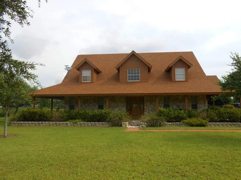 New listing in a country setting. 4 bedroom, 2 bath, and 2 half baths. Wrap-around porch, stone, mater bedroom downstairs, with formal dining and living area with breakfast nook. Master bath features Jacuzzi, shower, and double vanity. Tow large bedroom upstairs with full bath and big landing area that will accommodate desk or sitting area. 1 bedroom over garage with 1/2 bath. On 5.6 AC of irrigated pasture with 2 stall horse stalls. Located in the Harlingen School District.