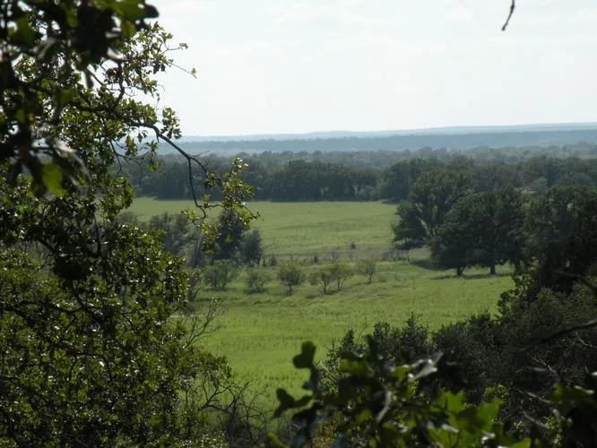 Terrain. The west side of the place is a lush bermuda grass valley with large trees around it. The east side has high elevations with beautiful views. The east side is heavily wooded with large oak and elm trees. So it has a mixture of terrain, with a lot of eye appeal. It is a great combination hunting, recreational and cattle or horse holding.