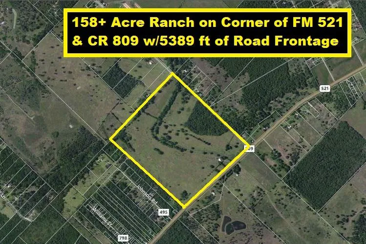 Ag Exempt! Nice Cattle Ranch on Corner of FM 521 & CR 809 w/2453 ft Road Frontage on FM 521 & 2936 ft Road Frontage CR 809. Pastures are cross-fenced for cattle w/2 gates on FM 521 & one on CR 809. Property has 2400 sf barn, 500 ft well installed in 2013, septic system, 12 acre hay field & pecan orchard. Property is not in City Limits! Appointment Required Due to Cattle on Property! Mobile home is not included in sale! Access to mobile home will not be allowed! Do Not Disturb Tenant! Can Be Commercial, Residential, or Multifamily! Very Low Taxes! No HOA fees! Cattle are negotiable. Perfect for residential subdivision, hotel, RV Resort, Distribution Center, Outlet Shopping Mall, Emergency Medical Center, office/warehouses, dairy farm, horse ranch, gas station, etc.