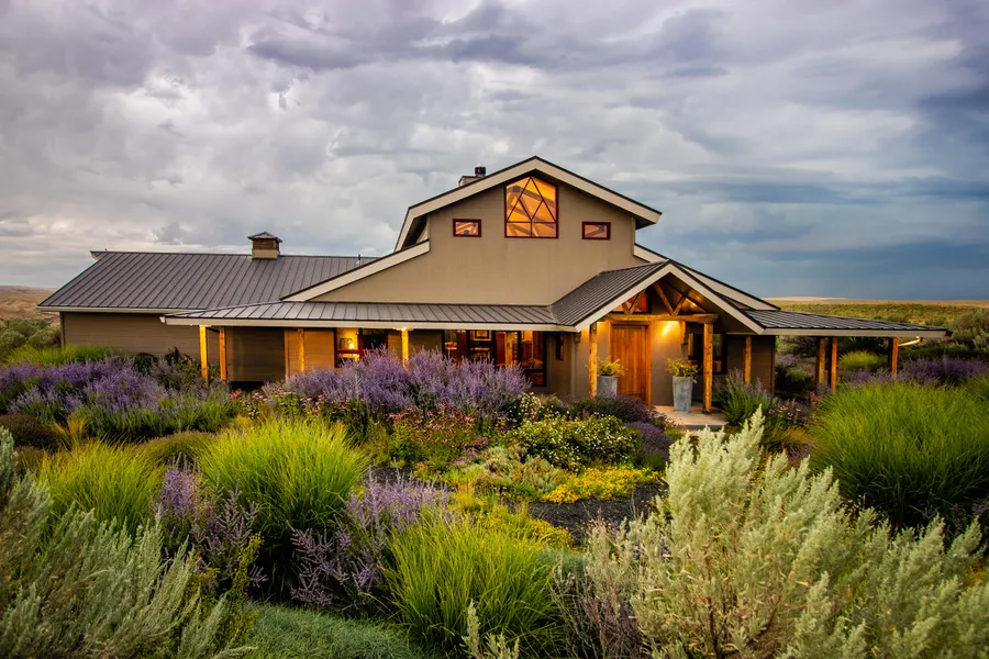 soaring cathedral ceilings with exposed trusses, custom Sierra Pacific wood clad windows, custom maple cabinets throughout, quartz counters, double sided fireplace. Master walk in closet and en suite bath with soaking tub. Attached 29' x 24' two+ car garage with storage room. Metal roof, Hardiplank siding, wrap around shaded porches and flagstone patio. Waterwise landscaping w/triple zoned sprinkler systems including pop up fire safety perimeters. 24' x 36' barn and 10' x 12' insulated storage shed/kennel. 90 acres in CRP.
