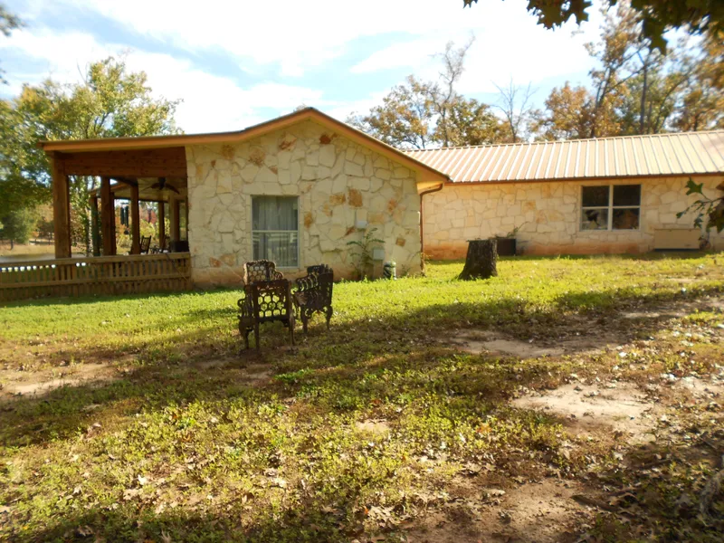 Nice stone home, 2/2, with metal roof on 16+/- acres with PRIVATE LAKE. Lake is approximately 3+/- acres in size with great view from the porch or through the glass windows of home. Home has high ceilings, ceiling fans, all tile floors and counters, horse stalls adjoin attached two car garage, four out buildings, stand by generator, fenced and cross fenced, pier on lake, and large back porch.