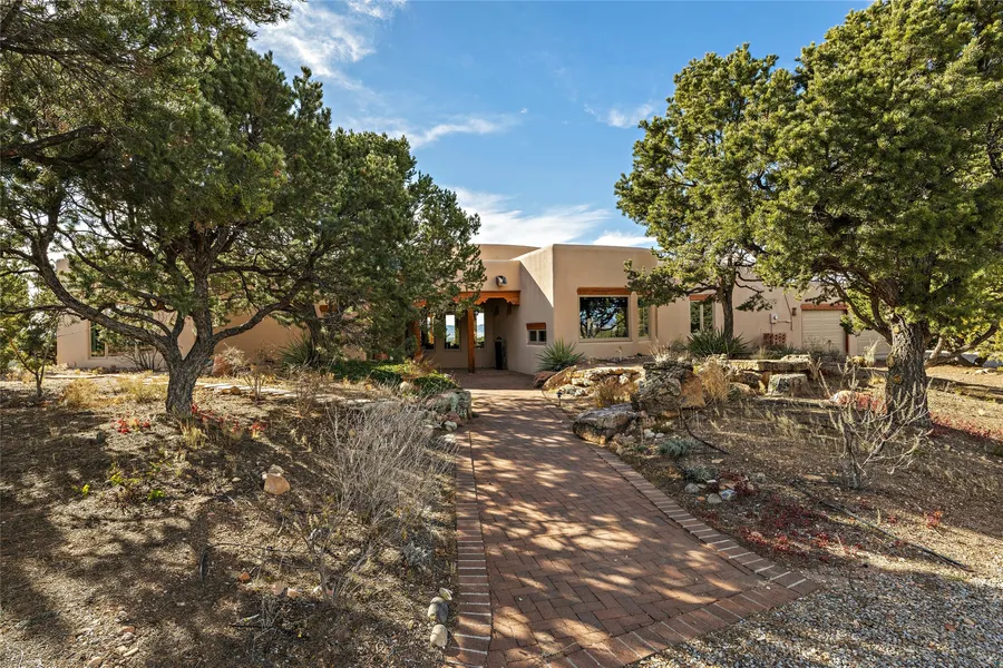 Sited on 16+ acres in La Tierra, this hilltop residence enjoys not only pivotal privacy but panoramic views in all directions. Built by Doug McDowell, the circular core of the residence - housing the formal living and dining rooms - is encased in floor-to-ceiling windows to capture a landscape dominated by the Jemez and Sangre de Cristo mountains. High ceilings throughout the home reiterate the overlook perspective particular to this location. A grand exterior portal, patio with kiva fireplace and rooftop landing were all designed to capitalize on the monumental views. Classic southwestern design elements abound in the consistent use of Saltillo tile throughout the home as well as coved and plank ceilings, vigas, wooden lintels, nichos and bancos. The kitchen is elegant and extremely functional with extensive counter space, a large center island and high-end appliances. Both the primary ...