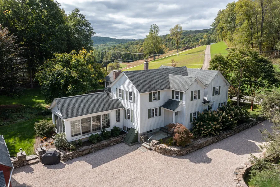 Antique Kent Hollow Colonial with views on a private 16+ acres set amongst beautifully tended gardens, stonewalls, and mature specimen trees. The main level of the home features a spacious eat-in kitchen highlighted with rustic beams and center island which opens to a light-filled sunroom with three walls of glass. In addition, the main level includes a formal dining room, a lovely living room with fireplace and exposed beams, a den with access to a stone patio, plus a main level bedroom and full bath. On the upper level, one finds the primary bedroom with vaulted ceiling and exposed beams plus a private bath and two additional bedrooms that share a bath. Property includes a detached barn with three garage bays plus space for workshop or garden storage. Located minutes to hiking at the East Kent Hamlet Nature Preserve, Lake Waramaug, and the village of New Preston, this is the perfect country retreat under two hours to NYC.