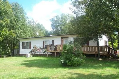 view of the front yard and the county road. Handicapped accessible ramp leads to front deck. There are two baths, a large utility room and lots of closets. The 16 acres is mostly wooded and is fenced on three sides. There are two storage sheds. Just a nice quiet place,