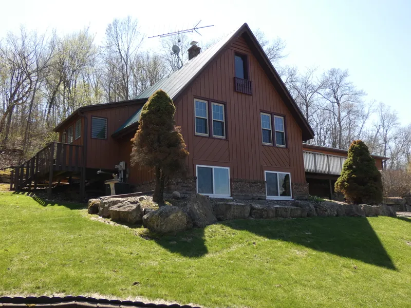 Beautiful landscaping and Wisconsin River valley views for this home situated in a very private location and now with 16 wooded acres. Adjoining land of about 200 acres is state owned for you to roam freely. Features 4 bedrooms, 3 bathrooms, living, family and rec rooms, tile and hardwood flooring, vaulted ceiling. A-frame chalet style with addition that is handicapped accessible, in-floor heat in garage. Large front deck, modern metal roof, concrete floor in barn style pole building with upper loft. Plenty to see here-let's take a good look today. Asking $259,000 if only one parcel with home and 6.5 acres.