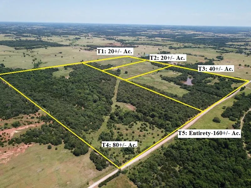 Tract #5 (Entirety): SE/4 of Sec. 36, Twp. 16N, R2 E.I.M. Lincoln Co., OK; Tract #1 (20 +/- Acres): N/2 of the NE/4 of the SE/4; Tract #2 (20 +/- Acres): S/2 of the NE/4 of the SE/4; Tract #3 (40 +/- Acres w/ Secluded Pond): SE/4 of the SE/4; & Tract #4 (80 +/- Acres w/ Timber Lined Creek): W/2 of the SE/4 Order of Auction: Tracts will be offered individually & in combinations to suit buyers.