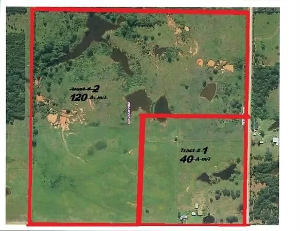 This Tract also includes a 40 x 50 Shop Building, Large Barn with Stalls and Loading pens, Covered R.V. & Trailer Building and 4 Ponds. Paved Road on 2 sides.