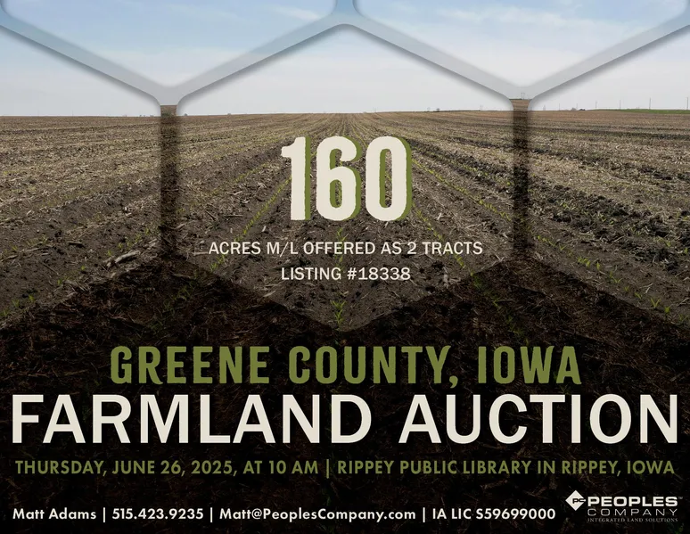 Mark your calendar for Thursday, June 26th, 2025, at 10 AM! Peoples Company is pleased to be representing Patricia I. Anderson Estate in the sale of their family farm, located just east of Rippey, Iowa, and northwest of Perry, Iowa. The farm consists of 160 acres m/l and will be offered as two individual 80-acre tracts. The tracts have great access off paved County Highway E57/290th Street and X Avenue, offering easy access to surrounding grain markets. These nearly 100% tillable tracts have an average CSR2 soil rating of 86.2, well above the Greene County average CSR2 soil rating of 78.3. The primary soil types include top-producing loam soils of Canisteo, Clarion, Webster, and Nicollet. The cropland acres are Non-Highly Erodible Land (NHEL), and a wetland determination was completed in 2016 that designated the farmland as Prior Converted/Non-Wetland. These tracts are located in Section...