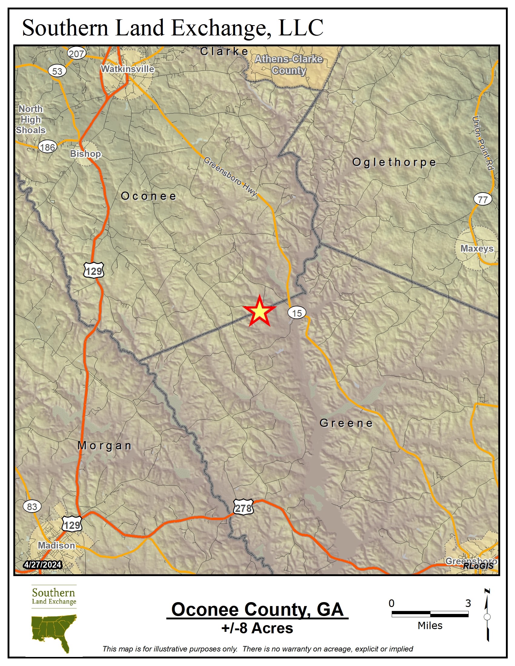 Southern Land Exchange is proud to present this +/- 8-acre estate lot located on beautiful Black Ike Road in Oconee County. Black Ike Road is a close-kept secret in the community and if you're lucky enough to own property there, you know why! Black Ike Road is beautiful, quiet, peaceful, and secluded, yet it's still not too far from town and has a Watkinsville, GA address. This property is located entirely in Oconee County, however the southern boundary line borders Greene County. The lot is essentially all wooded with a mix of mature hardwoods and natural regeneration pines. There is the perfect build site located at the highest point on the property. The build site is already mostly open and ready for your custom home atop the hill. Get more bang for your buck in South Oconee and say goodbye to the neighbors. If privacy is what you're after, this tract is a must-see. Additional characteristics include +/- 500ft of frontage on Black Ike, high-speed internet is available, and the seller will be putting in a driveway for the new owner. So, what are you waiting for?! For more information or to set up a tour, call Travis Ebbert with Southern Land Exchange at (706) 614-8840. Shown by appointment only.