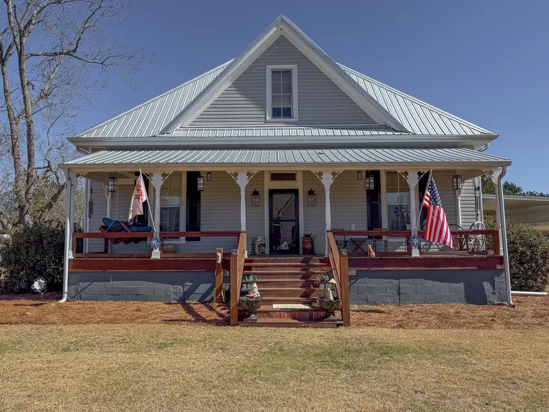 Recent improvements include a new metal roof with 6-inch galvanized gutters, a new 5-ton HVAC system with mini split, lighted crawlspace, backup generator, stained porches and awnings, underground dog fence, serviced septic system, and active termite bond.