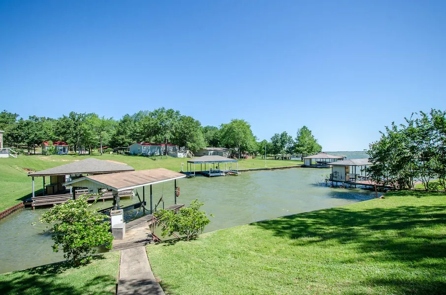 Great waterfront lake home located on canal with boat house. This home features a 3-car garage with half bath and plenty of storage on the lower level and living quarters on second level. Beautiful views of the lake from the large upper deck that is perfect for entertaining. Inside is a open living concept with a bright airy kitchen-breakfast area; large living room and large secondary bedrooms, one with an office overlooking the lake. Master suite features his and her walk-in closets and a large bath with jetted tub, dual sinks and wall of storage. Located on a heavily treed lot this home sits back off of the road for privacy. Come look at this one today.