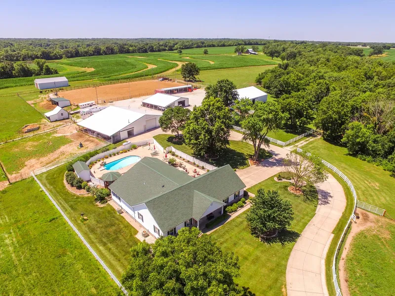 Exceptional equestrian facility on 40 manicured acres! This property is ideal for serious horse lovers! The barn, indoor riding arena, outdoor arena, machine shed and equipment shed are laid out perfectly and are extremely functional when it comes to raising, managing, and enjoying your horses or other stock.....This place is perfect! The sprawling ranch home is ideal for entertaining! When you're done with a long day riding...relax by the pool