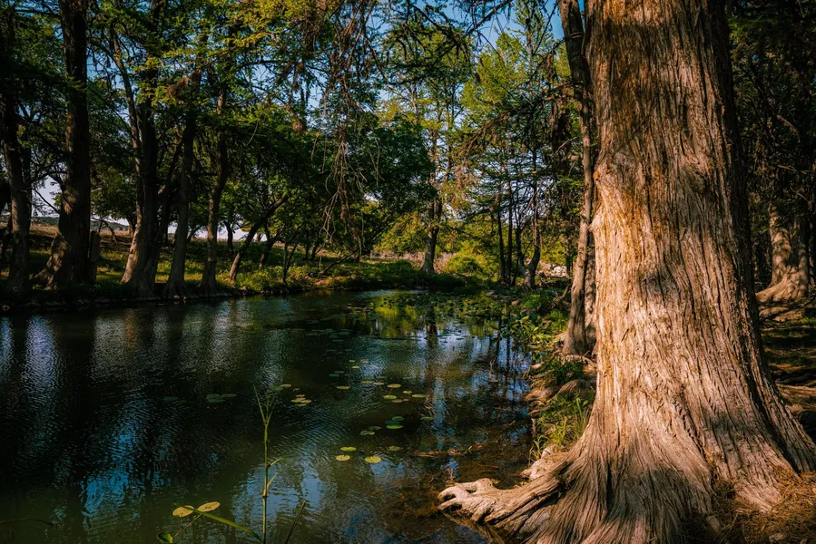 River frontage includes giant cypress trees and stunning water access. The property offers several large rock bluffs with majestic views of the Texas Hill Country.