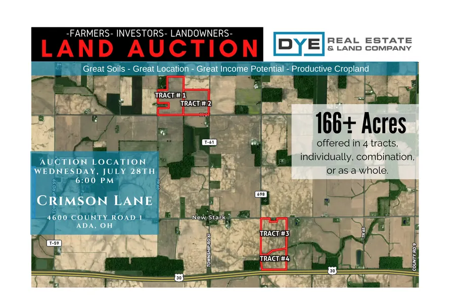 LAND AUCTION! 166 +/- ACRES HANCOCK COUNTY OFFERED IN 4 TRACTS (INDIVIDUALLY, COMBINATION OR AS A WHOLE), WEDNESDAY JULY 28, 2021 AT 6PM AT CRIMSON LANE (4600 COUNTY ROAD 1, ADA OHIO), GREAT INCOME POTENTIAL, PRODUCTIVE CROPLAND, GREAT SOILS, GREAT LOCATION, ANY ANNOUNCEMENTS MADE DAY OF SALE TAKE PRECEDENCE OVER PRINTED MATERIAL, SEE ATTACHMENTS FOR ADDITIONAL TERMS AND INFORMATION