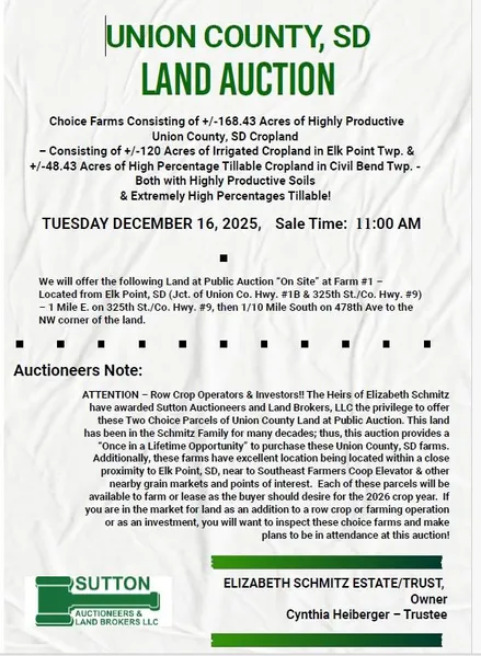 AUCTIONEERS NOTE: ATTENTION Row Crop Operators & Investors!! The Heirs of Elizabeth Schmitz have awarded Sutton Auctioneers and Land Brokers, LLC the privilege to offer these Two Choice Parcels of Union County Land at Public Auction. This land has been in the Schmitz Family for many decades; thus, this auction provides a Once in a Lifetime Opportunity to purchase these Union County, SD farms. Additionally, these farms have excellent location being located within a close proximity to Elk Point, SD, near to Southeast Farmers Coop Elevator & other nearby grain markets and points of interest. Each of these parcels will be available to farm or lease as the buyer should desire for the 2026 crop year. If you are in the market for land as an addition to a row crop or farming operation or as an investment, you will want to inspect these choice farms and make plans to be in attendance at this ...