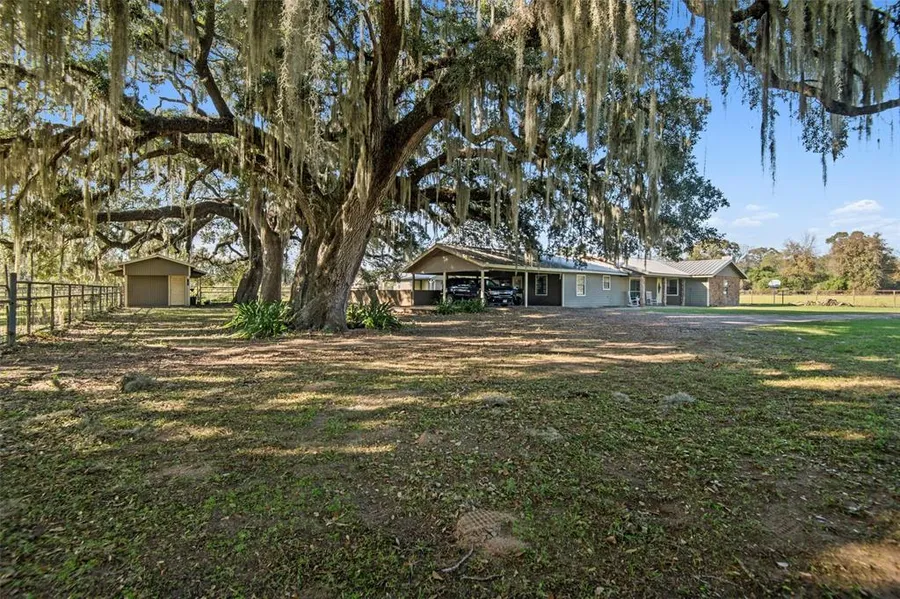 Nestled amongst a 100 year old oak tree and 17+/- acres, you will find this FULLY FENCED GEM of a home WITH pool, secondary residence/shop/office, horse stalls, pond and storage sheds! Inside you will find four bedrooms plus a flex room! The living room is filled with light thanks to its vaulted ceilings. Behind the home, there is also a generous horse barn attached to a two room climate controlled area; this area is pre plumbed for a full bath - perfect for a multi generational family, home office, craft room, home gym, etc. - endless options! This barn has a large covered concrete pad out front allowing for lots of storage or shaded seating areas. The large pool, is surrounded by decking and even has a pool house complete with bathroom and electricity waiting for your personal touches! All this, plus a LOW TAX rate and it's only minutes off the highway! This farmhouse checks ALL the boxes, plus leaves room to meet future needs. Words can't explain this amazing property!