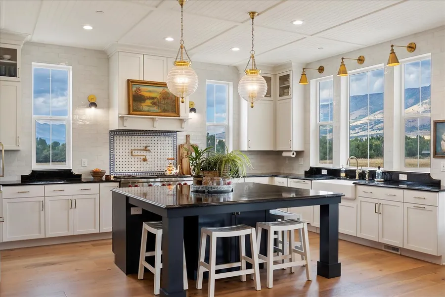Discover serenity and luxury combined at this stunning Huntsville, UT residence. Nestled in an idyllic landscape with mesmerizing mountain views, this home offers both visual appeal and supreme comfort. The elegant exterior, characterized by its classic dark blue siding and white trim, introduces a lavish interior featuring high ceilings, rich hardwood floors, and sophisticated architectural details.