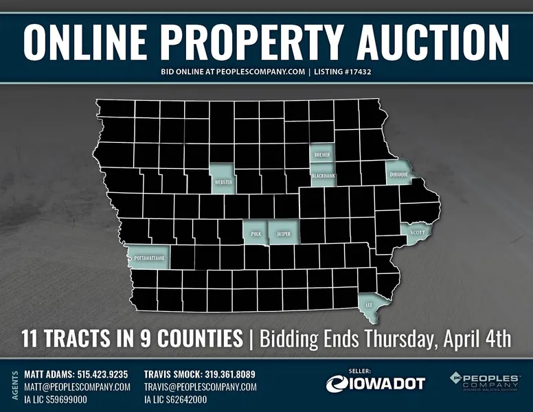 Peoples Company is offering eleven individual tracts owned by the Iowa Department of Transportation through an ONLINE ONLY auction where all bidding must be done online or through Peoples Companys bidding app. Bidding will be LIVE until Thursday, April 4th, 2024, at 4:00 PM Central Time Zone (CDT). Closing is to take place on or before Wednesday, May 15th, 2024. The tracts include various types of land located in nine different counties across the state of Iowa including Black Hawk, Bremer, Dubuque, Jasper, Lee, Polk, Pottawattamie, Scott, and Webster Counties.