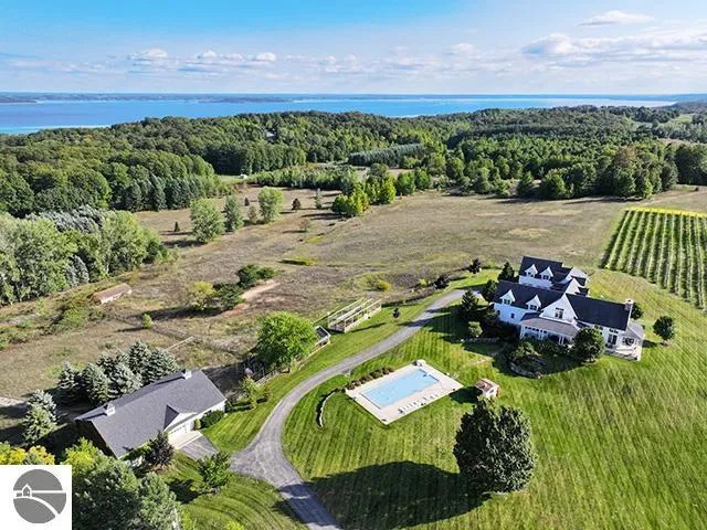GREAT NEWS! New owner can assume current owner's 4.35% mortgage on this spectacular, chic & artistic farmhouse in Leelanau county is surrounded by 17 acres of cherry orchards and vineyards. A Ken Richmond designed home which boasts its' own 3 acre working vineyard, barn, outdoor pool, sauna in primary suite shower and ice skating rink with lights- truly a 4 season FUN home! With 4 en-suite bedrooms, 5.5 baths (one with a steam shower) & over 8800 finished square feet, there is room for everyone. Bay views in 3 directions, including sunrises & sunsets from parts of the house. The living room is gracious and warm, with wood floors & vaulted ceiling, exposed beams & stone fireplace featuring a custom mantel. The kitchen/bar area features leathered granite & concrete counter tops, SubZero refrigerator w/ glass door window, Wolf commercial gas stove. Entertainment is easy with a sleek butlers pantry. Set amongst a rolling vineyard in Leelanau county, 50x70 two story barn, set up to house equipment on the upper floor while the lower area is suited for farm animals who can freely come in and out of the barn.